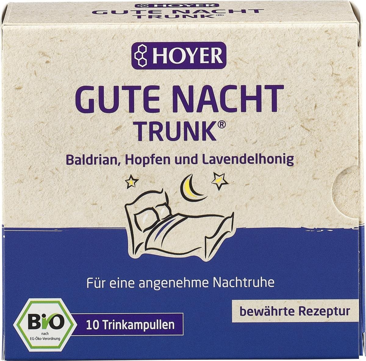 Nur sorgfältig ausgesuchte Pflanzen aus kontrolliert ökologischem Anbau und hochwertiger Bio-Honig werden für den HOYER Gute Nacht-Trunk schonend verarbeitet. Mit dem typischen Geschmack von Baldrian und Hopfen, abgerundet mit feinstem Lavendelblüten-Honig.