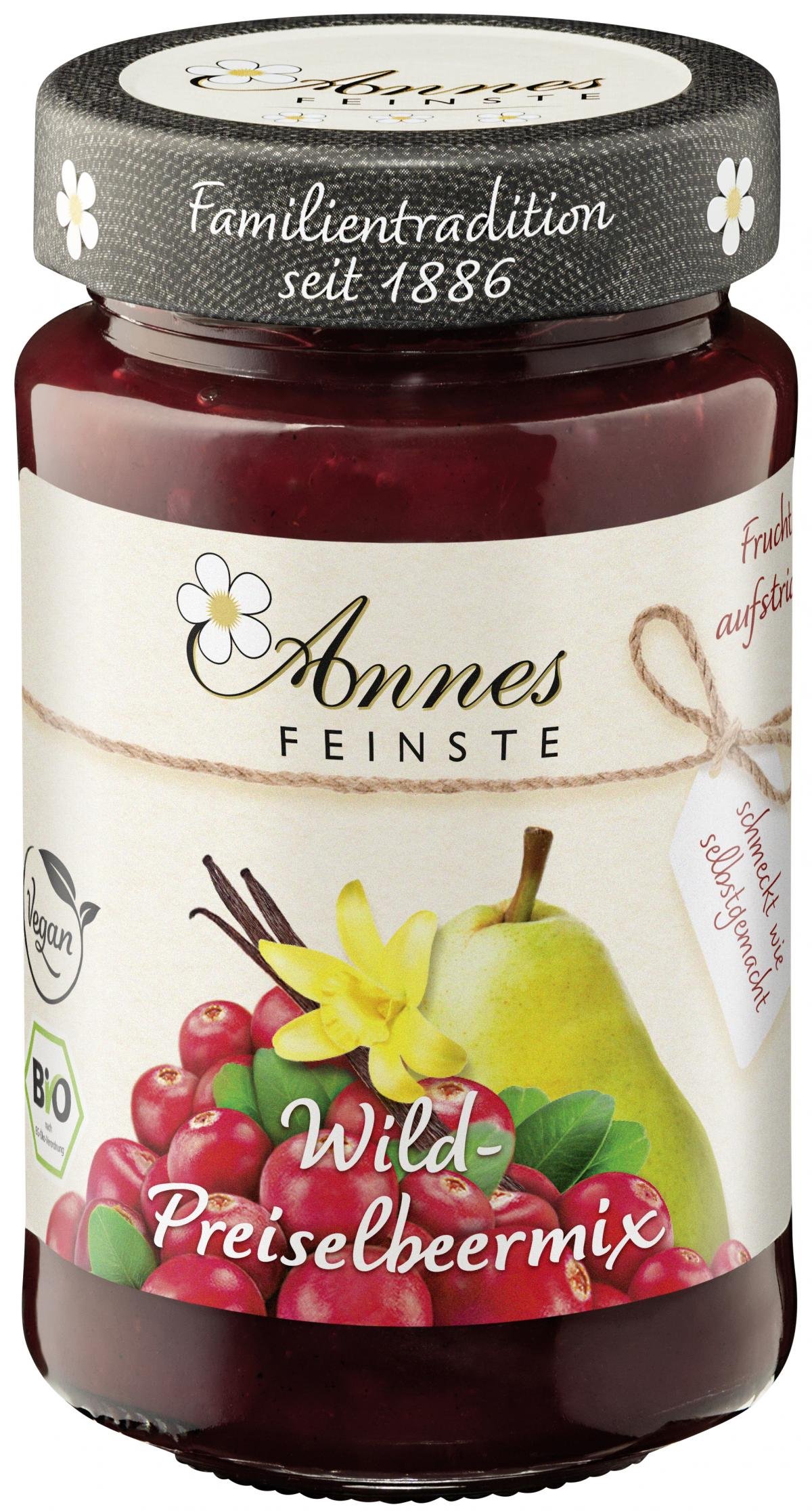 Wildgerichte kommen eigentlich nicht ohne sie aus - Preiselbeeren. Annes Feinste Preiselbeeren wachsen wild im rauen skandinavischen Klima. Denn nur unter den dort herrschenden klimatischen Bedingungen entwickeln sie ihr charakteristisches Aroma. Mit dieser fein abgestimmten Kreation lassen sich süße und deftige Speisen wunderbar verfeinern und auch auf Brot oder Brötchen sind sie ein köstlicher Genuss.