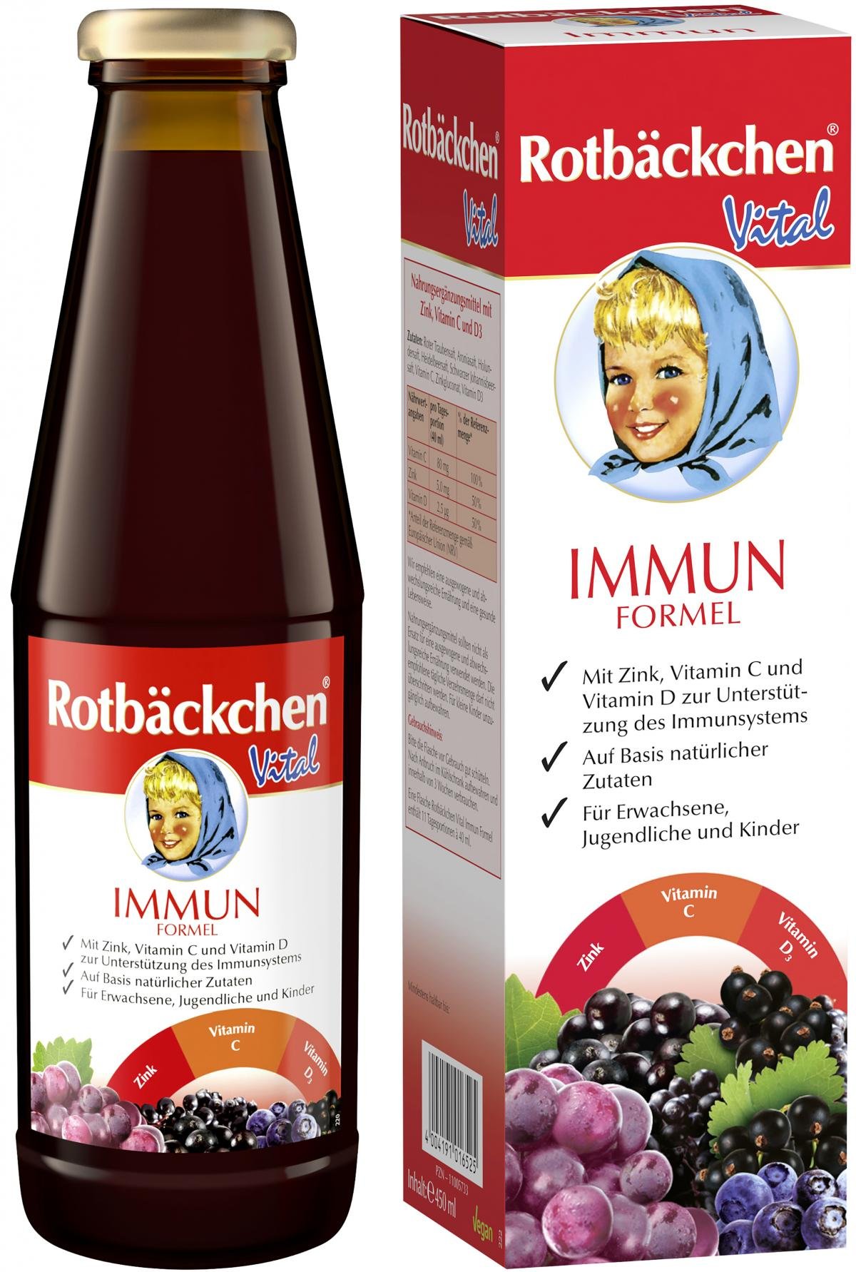 Für die normale Funktion des Immunsystems ist eine ausreichende Versorgung mit lebenswichtigen Nährstoffen unverzichtbar. Rotbäckchen Vital Immun Formel unterstützt die normale Funktion des Immunsystems mit Zink, Vitamin C und D3 gleich dreifach. Da der Körper Zink nicht selbst bilden kann, muss dieses lebenswichtige Spurenelement in ausreichender Menge über die Nahrung aufgenommen werden. Anders ist die Situation bei Vitamin D, dass vom Körper bei ausreichender Sonneneinstrahlung selbst gebildet werden kann. In der kalten Jahreszeit kann eine zusätzliche Versorgung mit Vitamin D sinnvoll sein, um den Bedarf an diesem wichtigen immunrelevanten Vitamin zu decken.