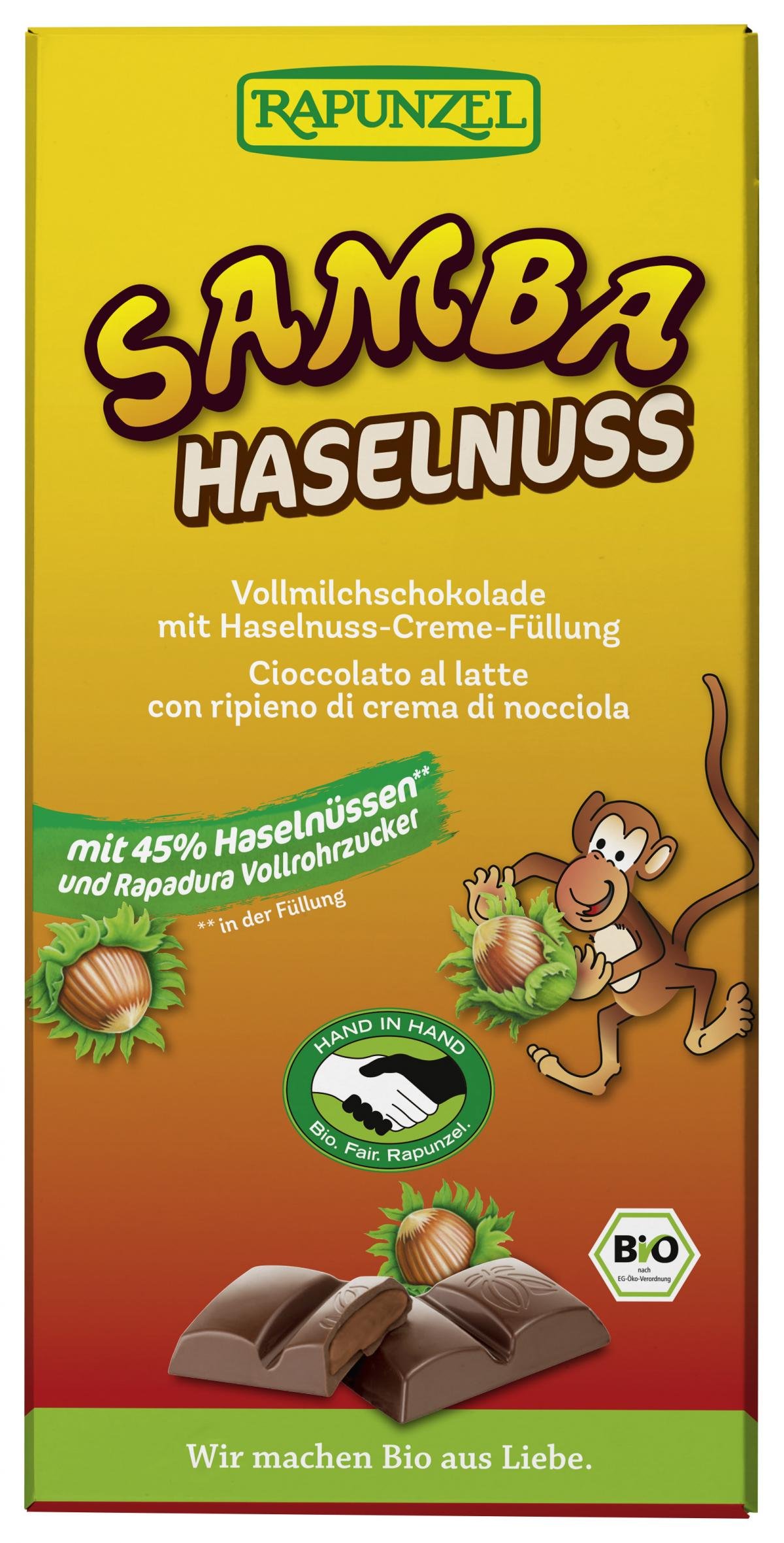 Für alle Samba-Fans, egal ob groß oder klein, gibt es den legendären Samba-Geschmack als Schokoladentafel. Feine Haselnusscreme mit tollem Schmelz umhüllt von knackiger Vollmilchschokolade. Mit 45% Haselnüssen und karamelligem Rapadura Vollrohrzucker in der Füllung, wie das beliebte Original. Fair gehandelt von Rapunzel HAND IN HAND-Partnern. Das intensive Conchieren ist neben den wertvollen Rohstoffen das eigentliche Geheimnis des wahren Schokoladengenusses. Durch die Kunst des Conchierens entwickelt sich der anfänglich noch verborgene Reichtum an kakaoeigenen Aromen Stufe um Stufe bis zur vollen Entfaltung. Gleichzeitig entsteht vollkommene Feinheit und der unvergleichlich zarte Schmelz.