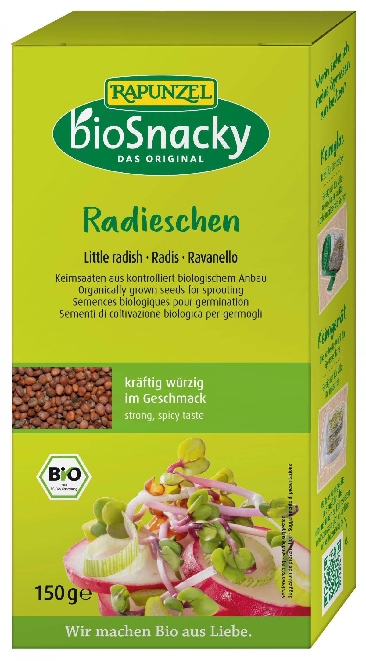 Radieschen-Sprossen sind kräfitg würzig im Geschmack. Die enthaltenen Senföle verleihen ihnen eine leichte Schärfe. Ideal als Topping für Salate, Brot, Pfannengerichte und Suppen sowie in Frischkäse und Dips. Sprossen sind die einfachste Methode, um zu jeder Jahreszeit wichtige Vitamine, Mineralstoffe, Spurenelemente, sekundäre Pflanzenstoffe und Ballaststoffe in die Ernährung zu bringen - und das ganz frisch geerntet und 'regional' von der heimischen Fensterbank!