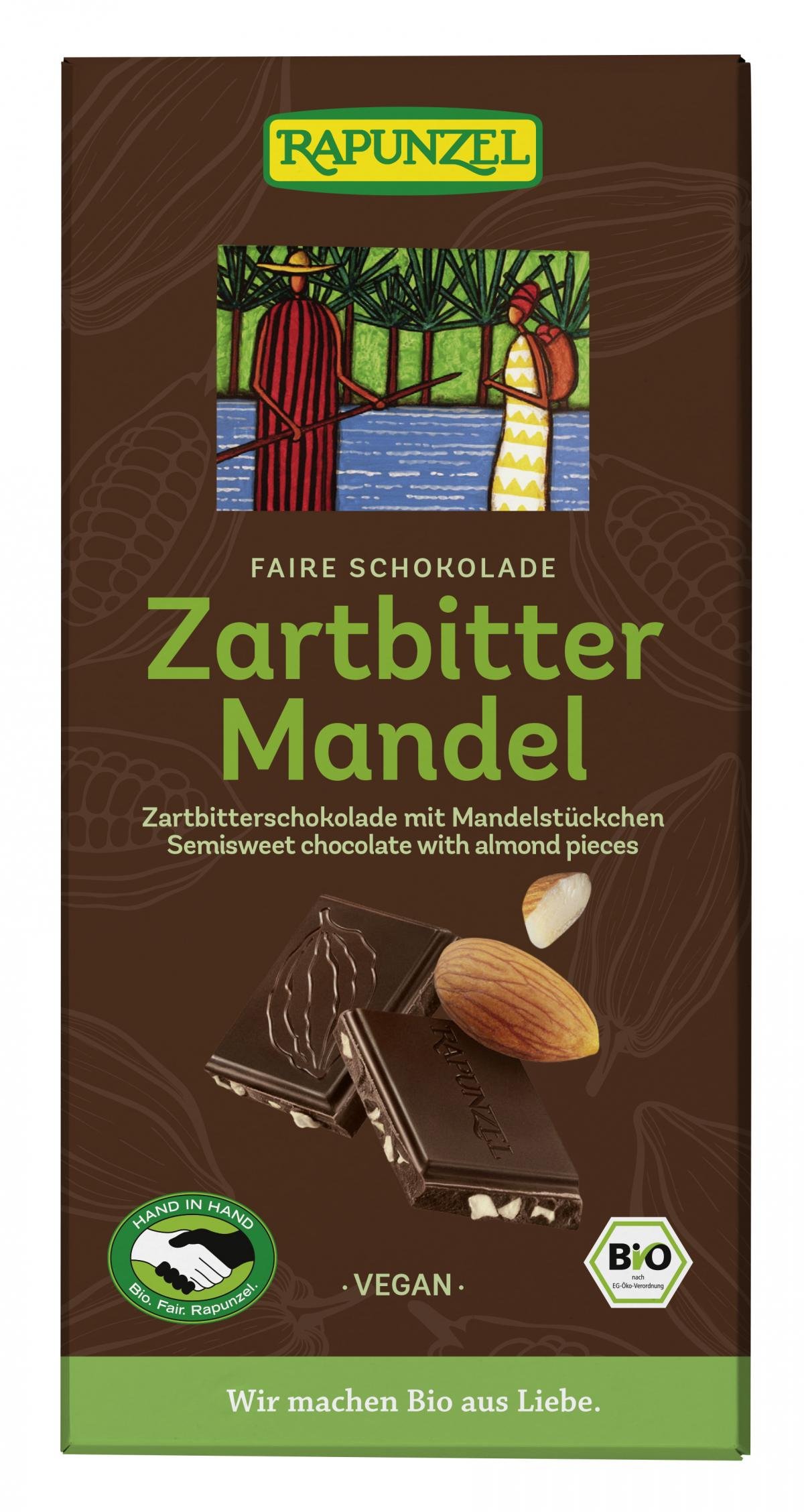 Viel feinherber Kakao und knackig geröstete Mandelstückchen verleihen der Schokolade ihr intensives Aroma. Rapunzel Schokolade steht für höchste Qualität nach Schweizer Herstellertradition verbunden mit wertvollen fair gehandelten Zutaten aus ökologischem Anbau. Das intensive Conchieren ist neben den wertvollen Rohstoffen das eigentliche Geheimnis des wahren Schokoladengenusses. Durch die Kunst des Conchierens entwickelt sich der anfänglich noch verborgene Reichtum an kakaoeigenen Aromen Stufe um Stufe bis zur vollen Entfaltung. Gleichzeitig entsteht vollkommene Feinheit und der unvergleichlich zarte Schmelz.