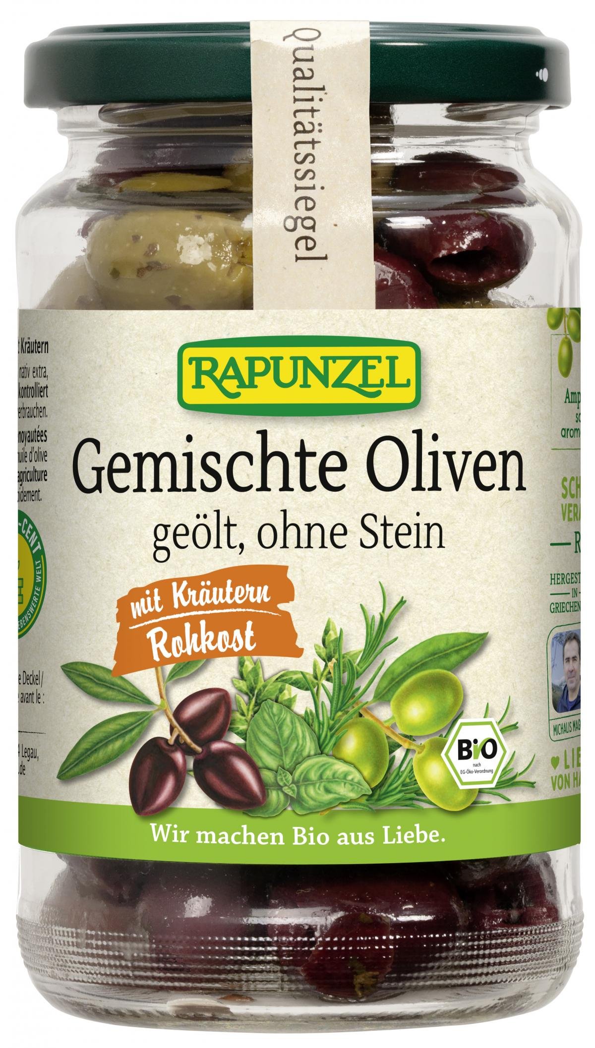 Grüne, aromatisch-fruchtige Amphissa Oliven mit besonders festem, saftigen Fruchtfleisch und fein-würzige Kalamata Oliven - eine tolle Kombination, die Abwechslung auf den Antipasti-Teller bringt. Die Oliven werden von kleinen Familienbetrieben in Griechenland sorgfältig angebaut und geerntet. Da die Verarbeitung besonders schonend und ohne Erhitzen erfolgt, behalten sie die hochwertige Rohkostqualität. Die Oliven sind entsteint und werden weder in Lake noch in Öl eingelegt: lediglich eine leichte Marinade aus bestem Olivenöl nativ extra und feinen Kräutern rundet den Eigengeschmack des mediterranen Olivenmix perfekt ab.