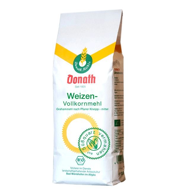 Der Donath Sprießkornweizen wird als volles Korn mit dem unbehandelten, lebenden Keim in altbewährter, handwerklicher Art auf Süßquarzsteinen langsam und werterhaltend frisch vermahlen. Das „Grahammehl nach Pfarrer Kneipp“ enthält das alle Bestandteile des Korns, einschließlich des unbehandelten, wertvollen Keims. Dadurch ist es besonders Ballaststoffreich und kann eine wohltuende Wirkung auf die leibliche Verfassung haben.