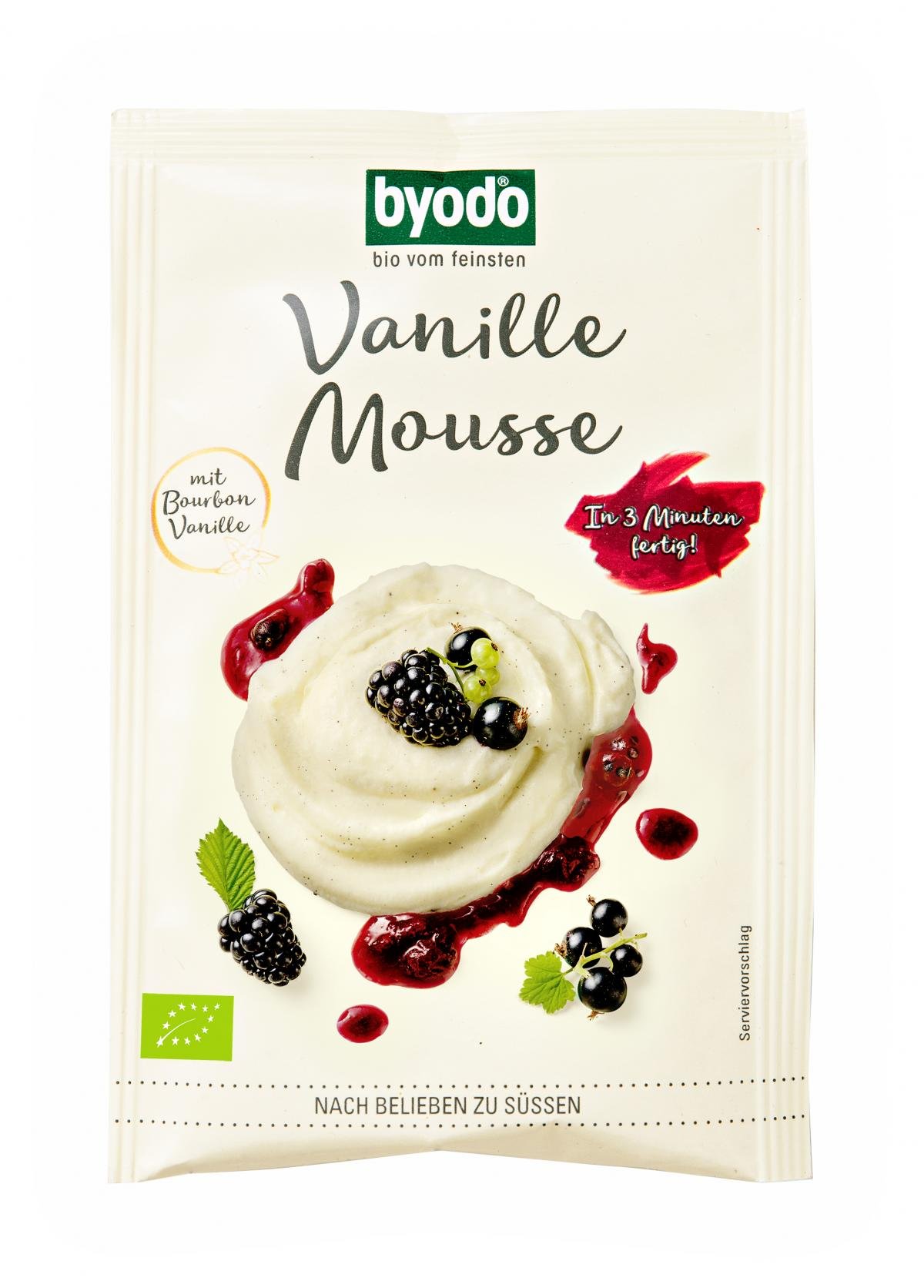 Mit ihrer herrlichen Vanillenote und samtigen Luftigkeit wird Sie die Vanille Mousse von Byodo verzücken. Das feine Pulver aus 100% Bio-Zutaten aus landwirtschaftlichem Anbau wird in wenigen Schritten und nur 3 Minuten wunderbar luftig aufgeschlagen, kann individuell gesüßt werden und sorgt für sofortigen Genuss.