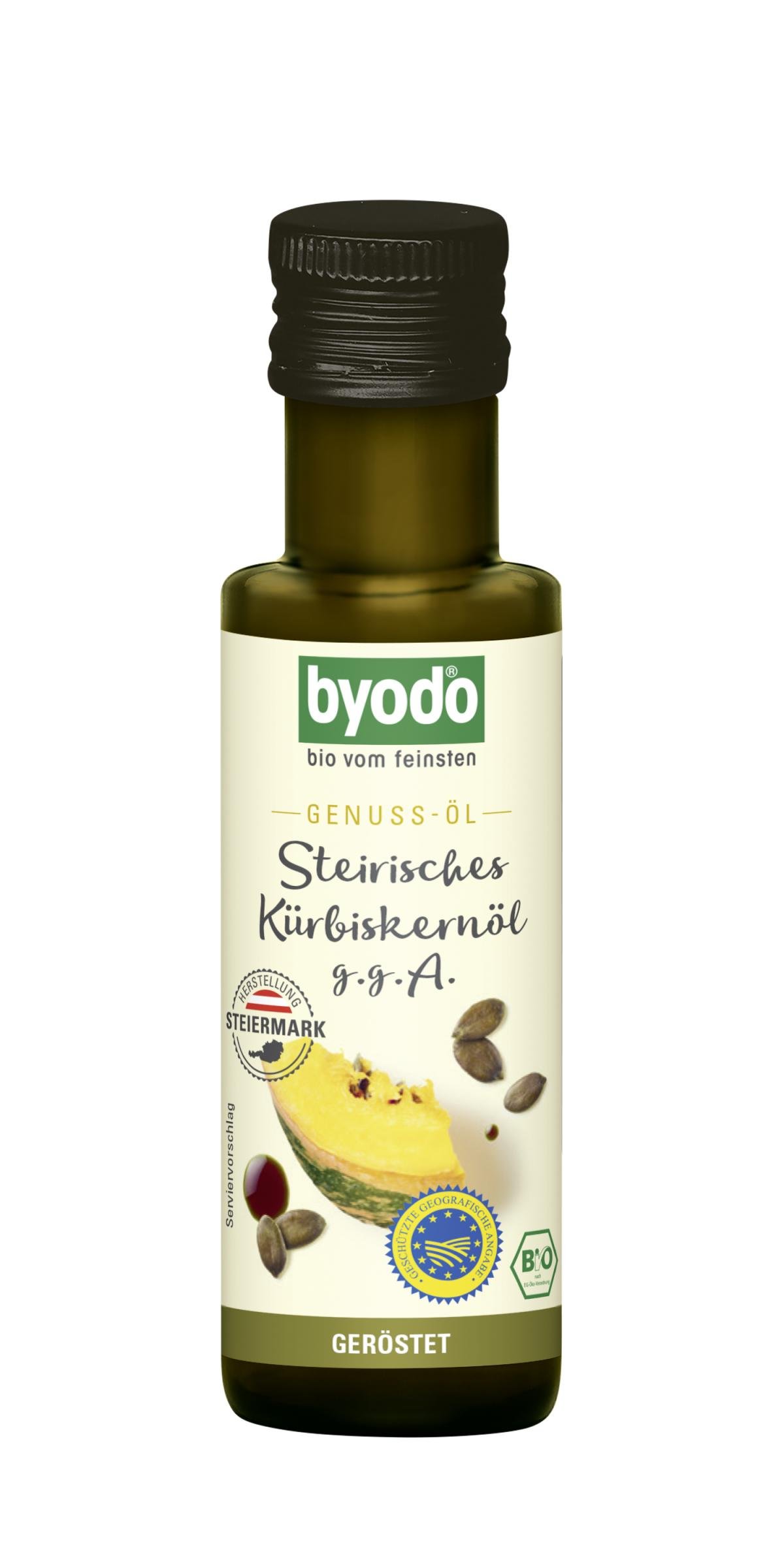 Für das kräftig-nussige steirische Kürbiskernöl g.g.A. von Byodo werden feine Bio-Kürbiskerne nach alter Handwerkskunst sorgsam geröstet. So entwickeln sie ihr intensives Aroma und geben dem wertvollen Öl aus erster Pressung, das reich an ungesättigten Fettsäuren ist, den wunderbar kräftigen Geschmack. Das feine Kürbiskernöl verfeinert wunderbar herzhafte Salate und Suppen, gibt aber auch Süßspeisen eine herrlich nussige Note.
