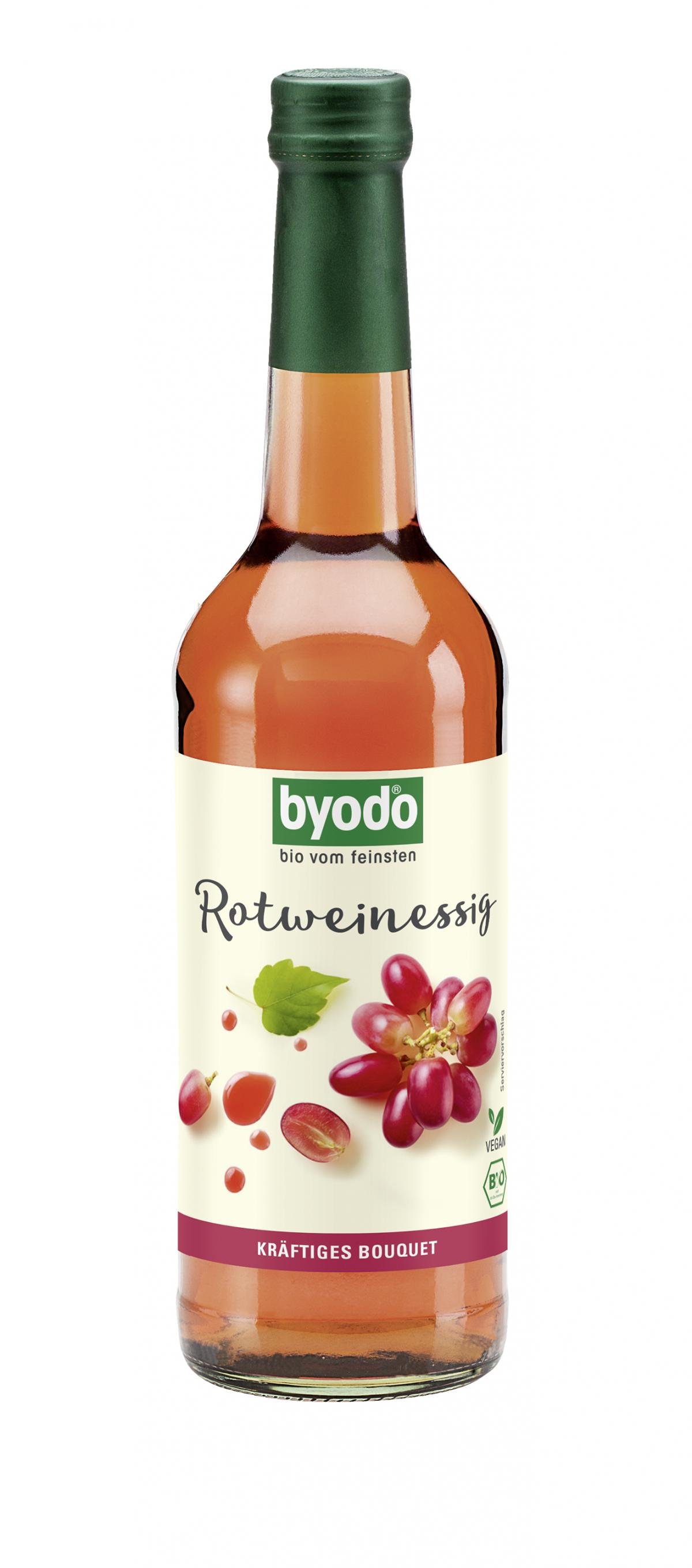 Der Byodo Rotweinessig wird aus feinem Tafelwein gewonnen und ist ein Multitalent in der Küche. Er wird nicht erhitzt.