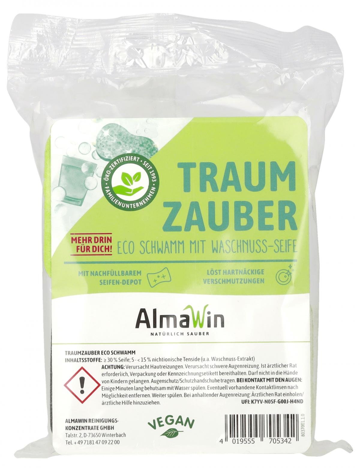 Der dreilagige TraumZauber Eco Schwamm wirkt doppelt gut: Die Edelstahlwolle mit Waschnuss-Seifendepot löst hartnäckige Verkrustungen besonders effektiv. Die Vlies-Seite aus Baumwolle ist zum Wischen und für die sanfte Reinigung von empfindlichen Oberflächen ideal. Plus, der Oeko-Tex-zertifizierte Schwamm ist sehr saugfähig und besteht überwiegend aus Sonnenblumenöl und ist durch Vegan Society ausgezeichnet.