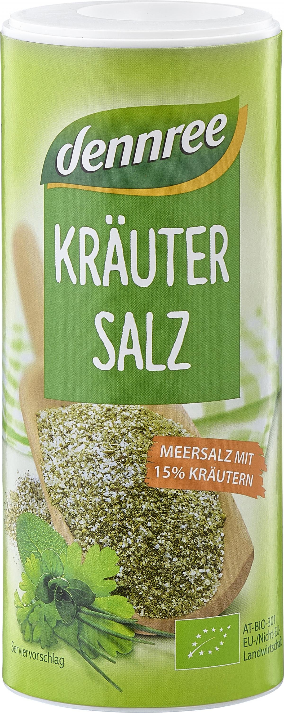 Meersalz mit Bio-Kräutern bietet reinen Genuss. Das dennree Kräutersalz wird aus Meersalz sowie schonend getrockneten Kräutern hergestellt und mit Karottenstückchen, Knoblauch und schwarzem Pfeffer verfeinert. Vielseitig einsetzbar eignet es sich besonders zum Würzen und Verfeinern von Salaten, Suppen, Saucen und Gemüse sowie für Kräuterquark und Kräuterbutter.