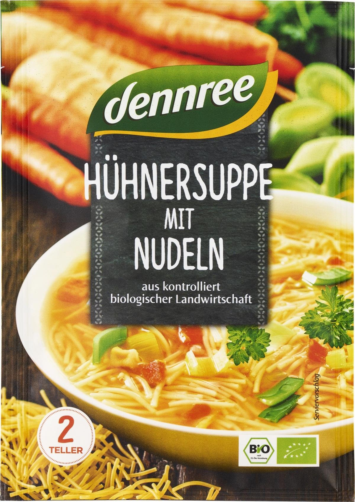 Bio-Hühnersuppe mit Nudeln bietet reinen Genuss. Die dennree Hühnersuppe wird aus einer kräftigen Hühnerbrühe mit Bio-Suppennudeln, Karotten, Pastinaken, Lauch und Zwiebeln hergestellt sowie mit aromatischen Gewürzen und Petersilie verfeinert. Genießen Sie den fein-würzigen Geschmack.