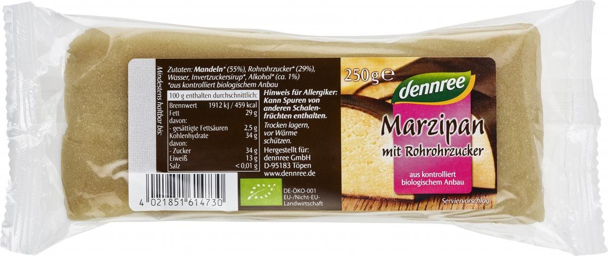 Bio-Marzipan mit Rohrohrzucker bietet reinen Genuss. Für das dennree Marzipan mit Rohrohrzucker werden knackige Mandeln und feiner Rohrohrzucker aus kontrolliert biologischem Anbau verwendet. Es eignet sich bestens zum Backen oder Dekorieren.
