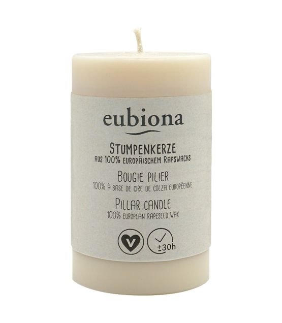 Die weisse Stumpenkerze aus natürlichem Rapswachs der Marke Eubiona wird in Handarbeit in Deutschland hergestellt. Sie wird ohne Dochthalter geliefert.