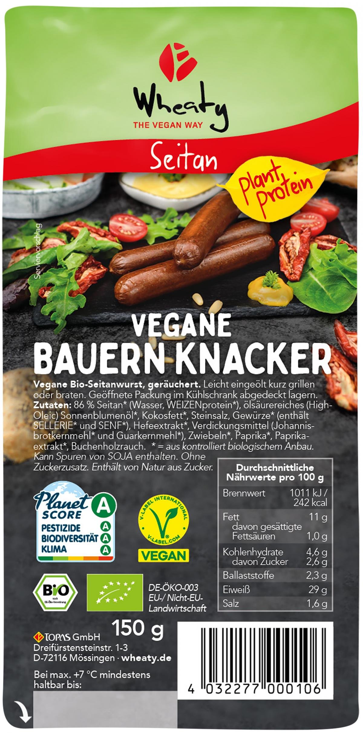 Die Bauern-Knacker von Wheaty sind knackig und schmecken vertraut. Mit ihrem feinen Rauchgeschmack erinnern sie an deftige ländliche Bratwürste und bescheren ein wahrhaft knackiges Wurstvergnügen