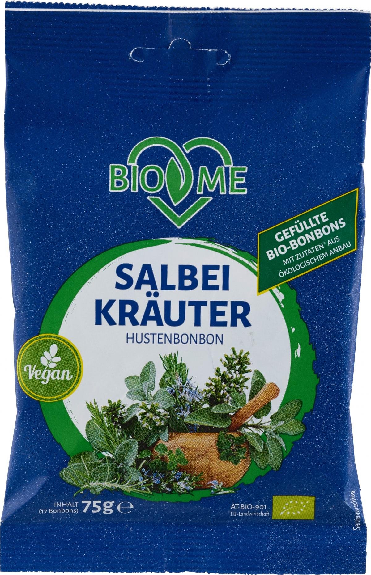 Gefüllte Bio-Salbei-Kräuter-Bonbons mit 20 edlen Kräutern aus der Natur: Brombeerblätter*, Bibernellwurzel*, Kornblumen*, Ringelblumen*, Malvenblätter*, Holunderblüten*, Lindenblüten*, Pfefferminzblätter*, Schlüsselblumen*, Sternanis*, Salbeiblätter*, Fenchel*, Spitzwegerichkraut*, Thymian*, Schafgarbenkraut*, Süßholzwurzeln*, Anissamen*, Kamillenblüten*, Ehrenpreiskraut*, Eibischwurzeln*.