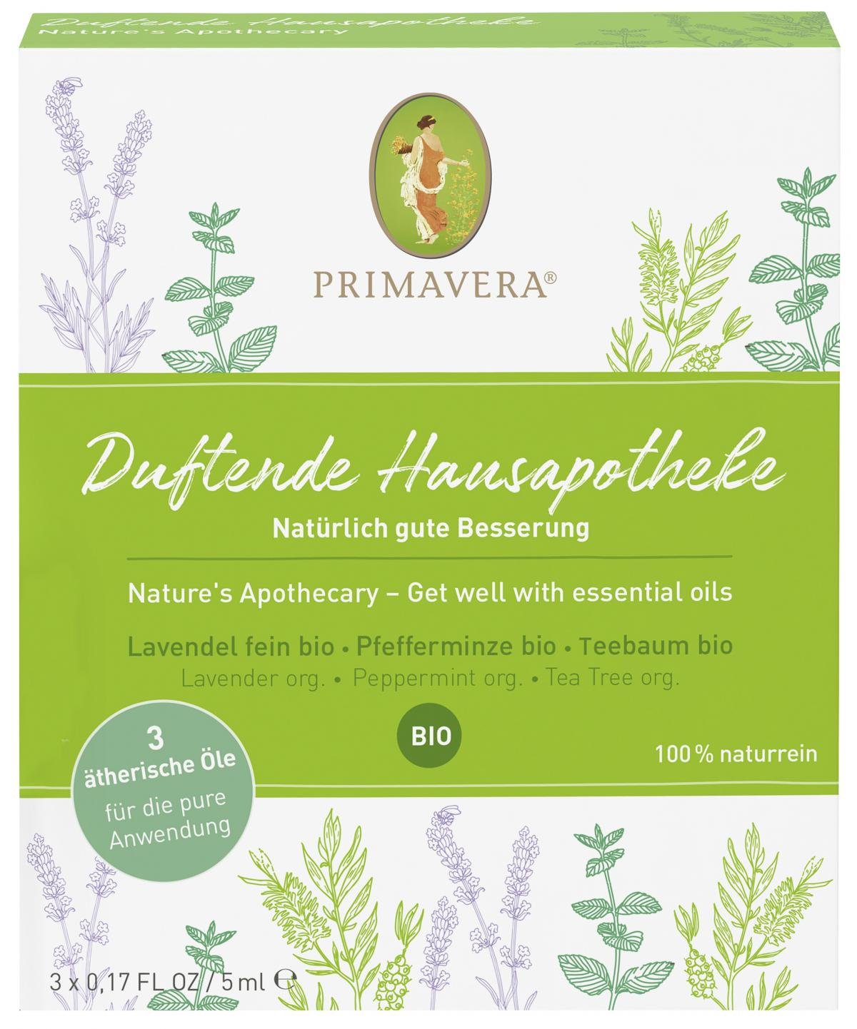 Inhalt 3x5ml Ätherische Öle: Lavendel fein bio 5ml, Teebaum bio 5ml und Pfefferminze bio 5ml
