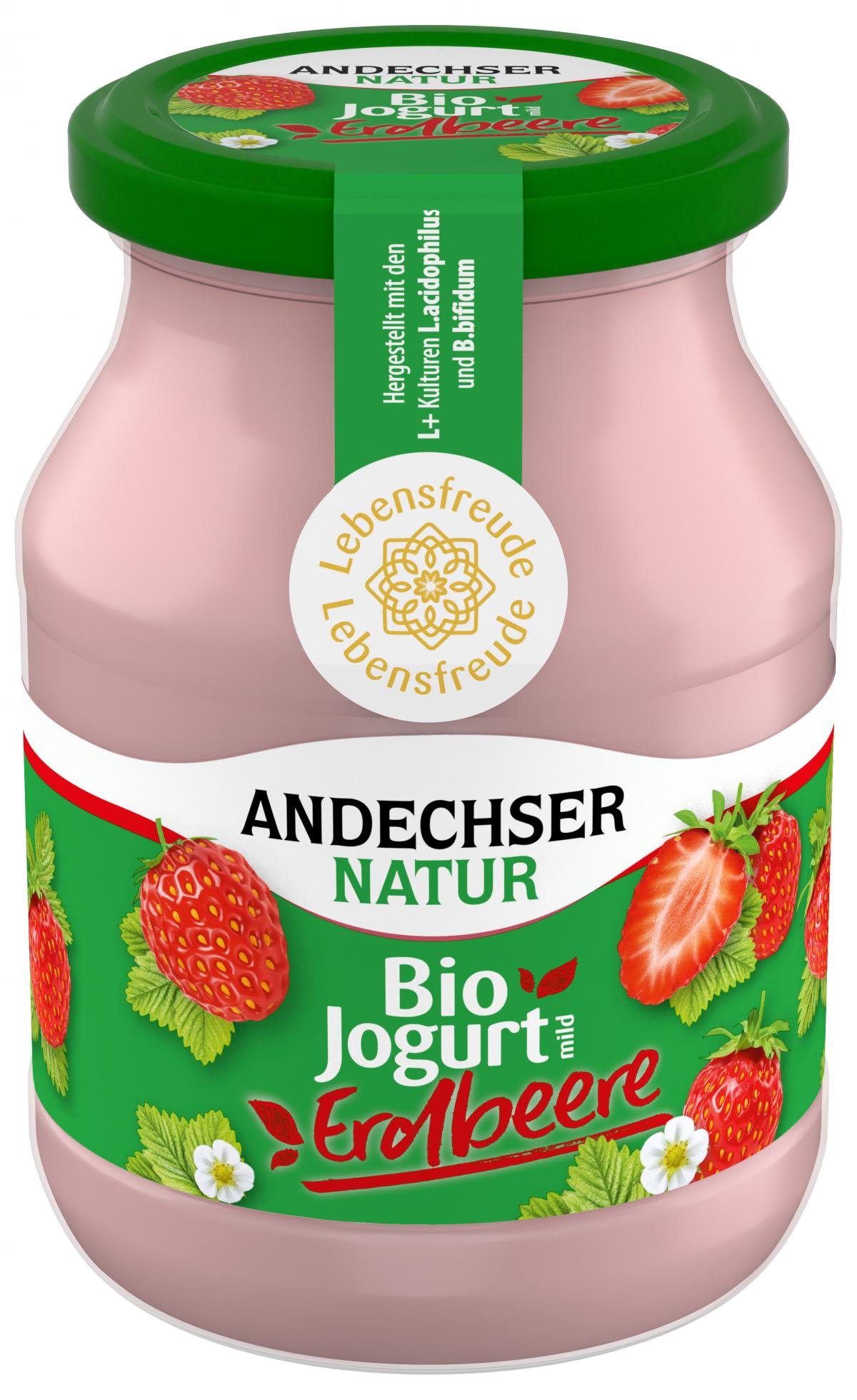 Der ANDECHSER NATUR Bio Jogurt mild Erdbeere mit 3,8% Fett im 500g Mehrwegglas verwöhnt mit cremiger Fruchtigkeit und wird aus besten Bioland-Zutaten, ohne Aromazusatz hergestellt.