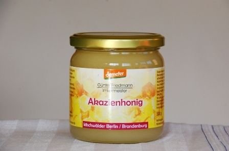Diesen Akazienhonig sammeln unsere Bienen in den lichten Mischwäldern um Berlin und in Brandenburg. Der verschwenderische Duft der Blüten macht die Bienen und den Imker glücklich. Akazienhonig zeichnet sich durch eine mild-aromatische Süße aus, mit einer feinen Note von Marzipan.