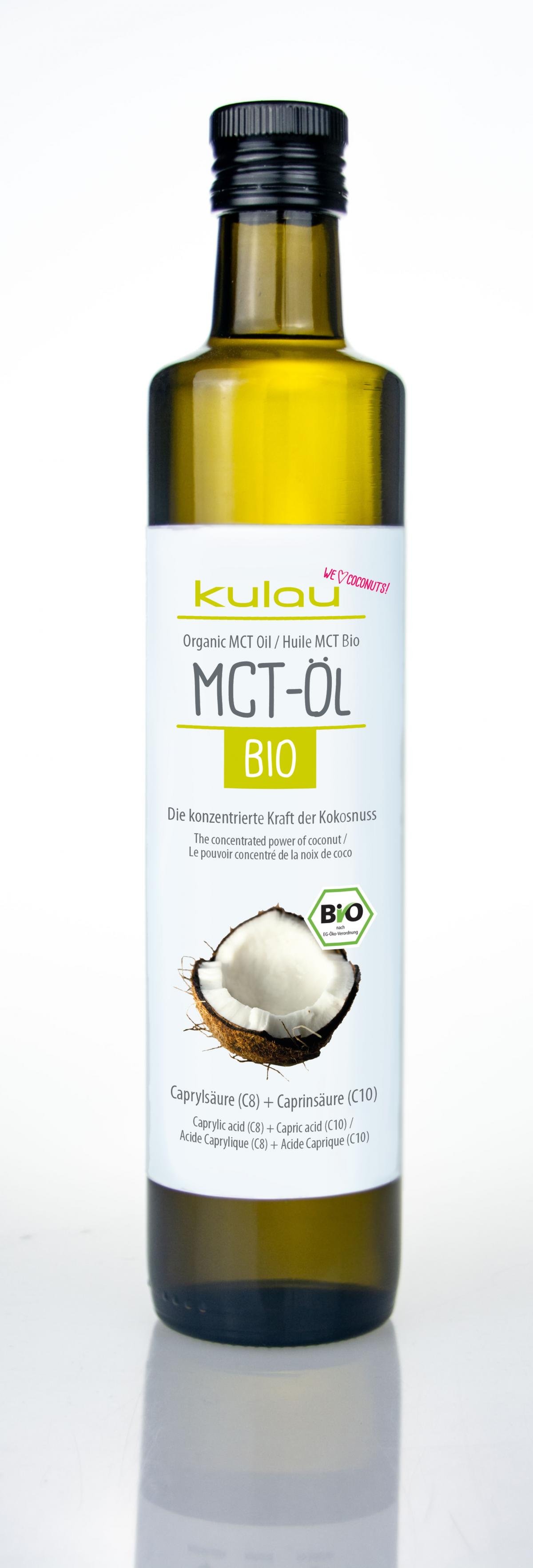 Endlich: MCT-Öl in 100 Prozent Bio-Qualität! Dank der enthaltenen, schnell verstoffwechselbaren Fettsäuren Caprylsäure und Caprinsäure, sorgt das Öl für eine besonders effektive Energiezufuhr. Die Energie wird aus Ketonen (Fett) anstatt aus Glucose gezogen und verhindert somit, dass Insulin ausgeschüttet wird. Es erleichtert die Fettresorption im Darm aufgrund mittelkettiger Fettsäuren. Die Konzentrations- sowie körperliche Leistungsfähigkeit können gesteigert werden. Das Öl ist im Gegensatz zu normalem Kokosöl flüssig, enthält keine Kohlenhydrate und schmeckt nicht nach Kokosnuss. KULAU Bio-MCT-Öl kann vielseitig in der Küche im Rahmen einer bewussten Ernährung eingesetzt werden – z.B. für Salatdressings, Smoothies oder im Kaffee nach Bulletproof-Art.