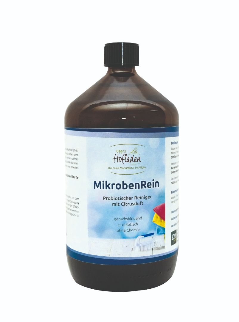 MikrobenRein Universalreiniger reinigt mit der Kraft der Effektiven Mikroorganismen probiotisch. Oberflächen werden strahlend sauber, ohne dass sich Rückstände bilden. Unangenehme Gerüche werden nachhaltig beseitigt. Die positiven Mikroorganismen in MikrobenRein Universalreiniger besiedeln die Oberflächen und wirken einer erneuten Verschmutzung entgegen. MikrobenRein aus Epps Hofladen wird mit Zitronenverbene aus eigenem Anbau, sowie mit Allgäuer Apfelsaft von unseren eigenen Streuobstwiesen hergestellt. Wichtig war uns hierbei, möglichst viele Rohstoffe von unserer Allgäuer Landwirtschaft, bzw. aus der Region zu verwenden, denn ein wertvolles Produkt kann nur aus wertvollen Zutaten entstehen. Geeignet für alle Oberflächen, wie z. B. Fließen, Holzböden, Glas, Keramik, Marmor, Polster, Teppich etc.
