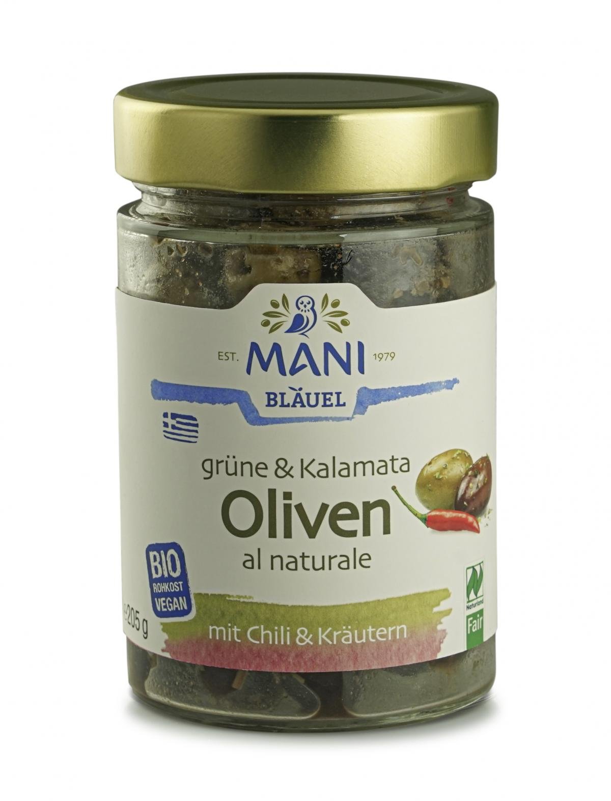 Diese feinen, Bio Tafeloliven der Sorte Konservolia und Kalamon - auch bekannt als Amfissa und Kalamata Oliven - werden nur in Bio Olivenöl nativ extra mit Chili und Kräutern mariniert und direkt vakuumverpackt- der pure Geschmack der edlen Oliven in Rohkost-Qualität!
