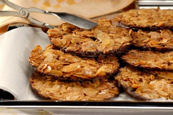 Konditoreigebäck in Oblatenform mit Mandeln und Schokoladenüberzug
