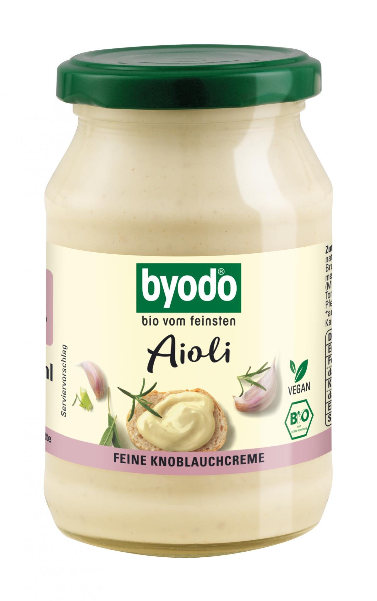 Für die Byodo Aioli werden feine 100% Bio-Zutaten aus landwirtschaftlichem Anbau wie milder Weißweinessig und Olivenöl, nativ extra mit frischem Bio-Knoblauch verarbeitet. Die vegane Salatcreme wird auf Basis von Sonnenblumenprotein hergestellt und ist daher besonders cremig. Danke 42% Fettgehalt ist die lecker-luftige Creme ein verführerischer Genuss z.B. zu Tapas, Gegrilltem, Baguette und Häppchen.
