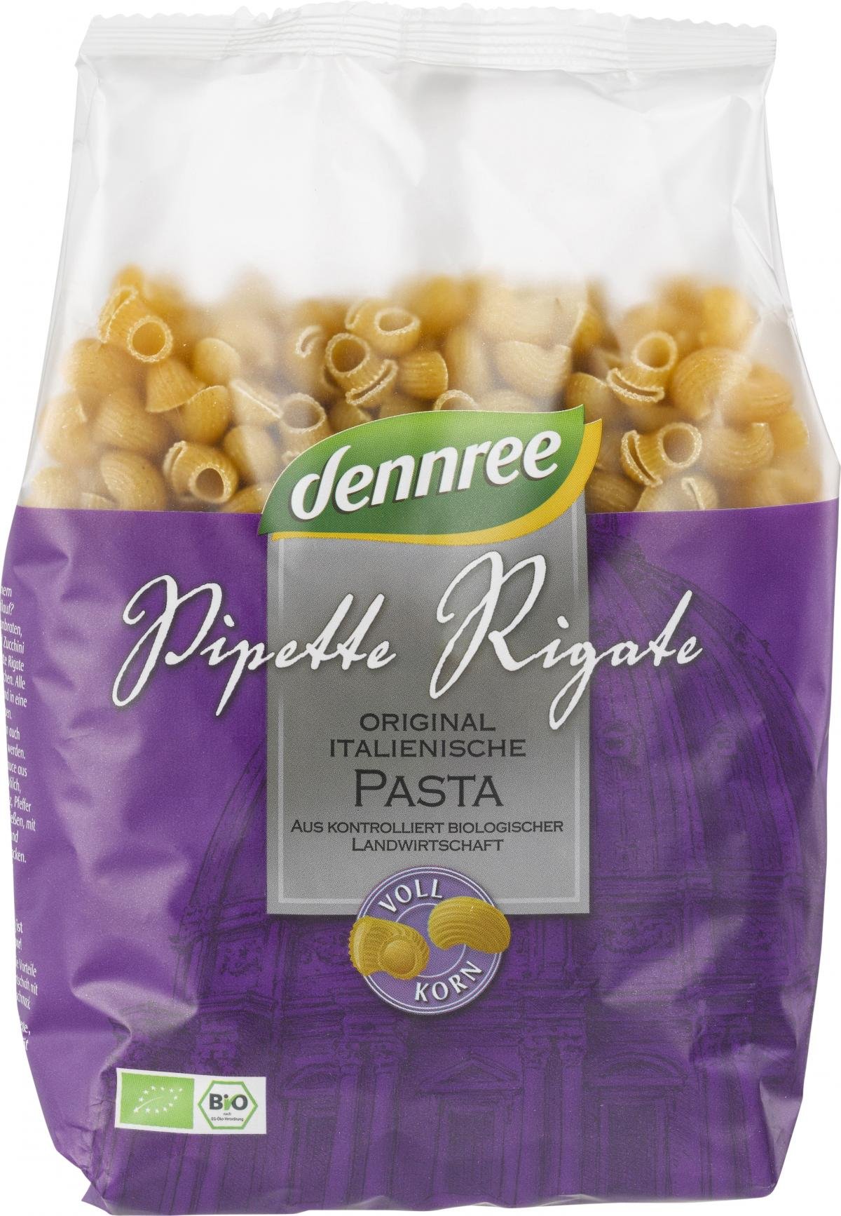 Bio-Hartweizen-Vollkorn-Pipette Rigate bieten reinen Genuss. Für die dennree Hartweizen-Vollkorn-Pipette Rigate wird nur ausgewählter Hartweizen aus kontrolliert biologischer Landwirtschaft verwendet und nach original italienischem Rezept schonend verarbeitet. Genießen Sie den exzellenten Geschmack und den idealen "al dente" Biss der dennree Pasta.