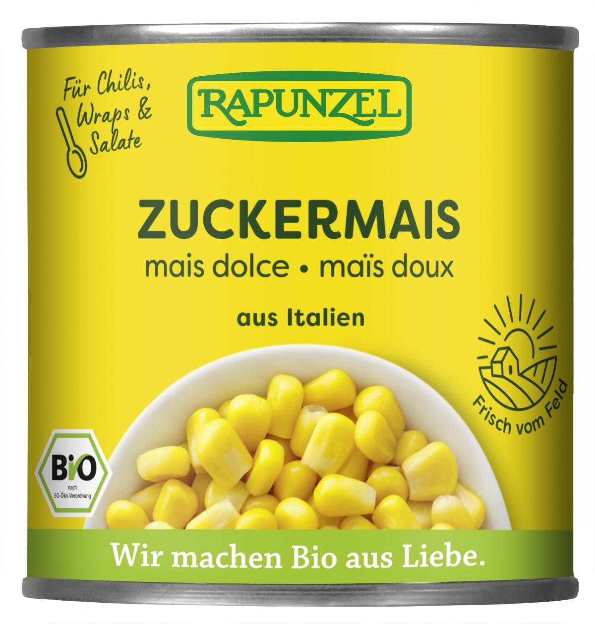 Süßer Zuckermais aus Italien, fix & fertig gekocht - für die schnelle Bio-Küche! Der goldgelbe Mais der Sorte Supersweet schmeckt mild süßlich und hat einen leicht knackigen Biss. Er wird direkt nach der Ernte verarbeitet und in maximal 6 Stunden gegart und in Dosen abgefüllt. Erntefrische Qualität, die man schmeckt. Die Einweich- und Kochzeit entfällt, da der Mais schonend vorgekocht ist.